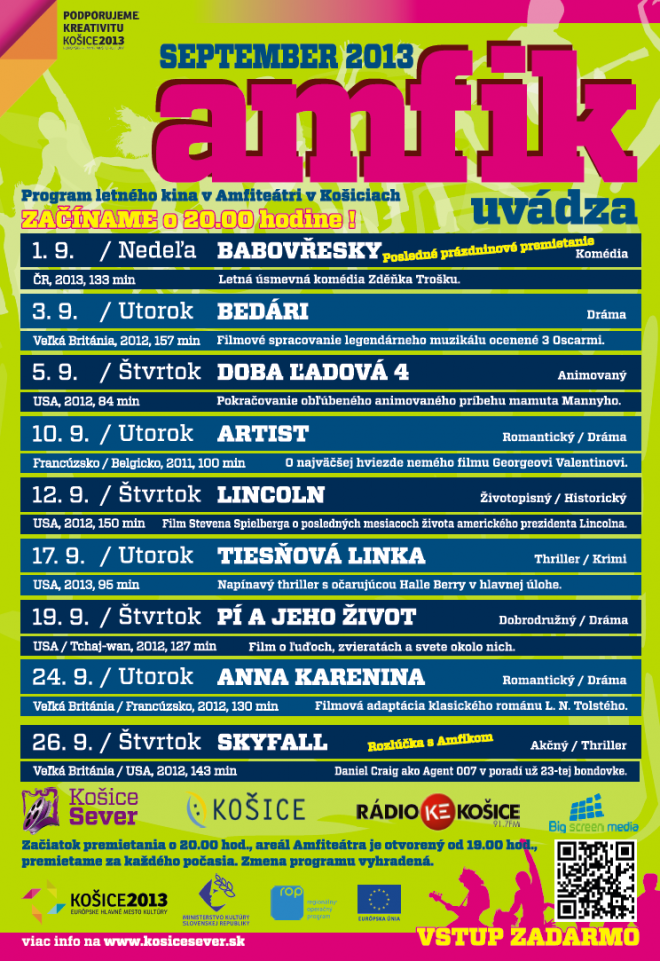 V rámci programu EHMK sa v amfiteátri organizuje podujatie s názvom Amfik uvádza. POZOR zmena, v septembri začíname premietanie vždy o 20.00 hod.