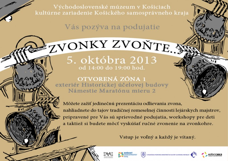 Východoslovenské múzeum v Košiciach, kultúrne zariadenie Košického samosprávneho kraja, vás pozýva na podujatie ZVONKY ZVOŇTE… 5. októbra 2013 na Námestie Maratónu mieru 2. Môžete zažiť jedinečnú prezentáciu odlievania zvona, nahliadnete do tajov tradičnej remeselnej činnosti lejárskych majstrov, pripravené sú pre vás sprievodné podujatia, workshopy pre deti a taktiež si budete môcť vyskúšať ručné zvonenie na zvonkohre.